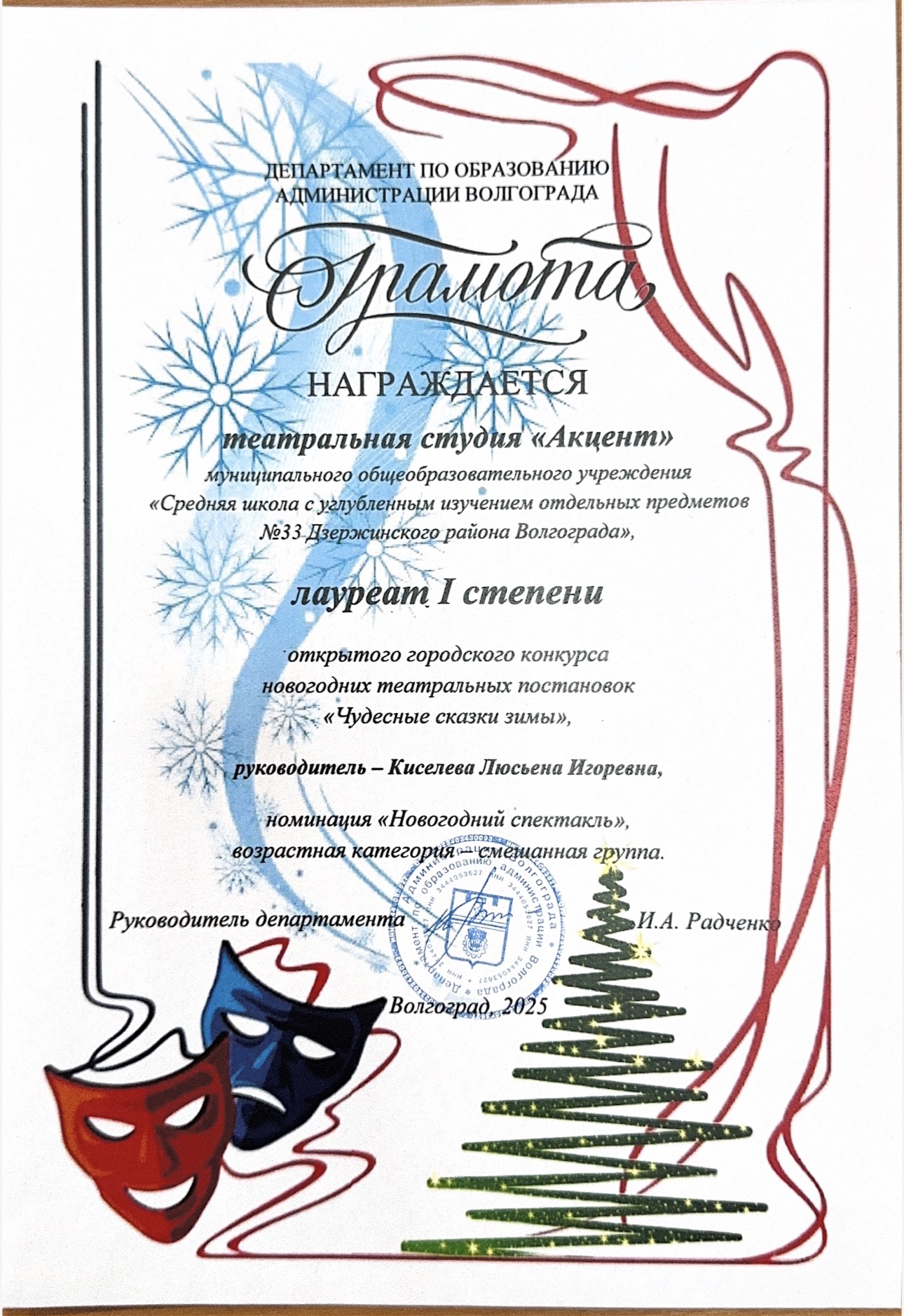 В 2017 году руководителем школьной театральной студии стала педагог дополнительного образования Киселева Люсьена Игоревна. В 2024 году ребята стали лауреатами 1 степени открытого городского конкурса новогодних театральных постановок «Чудесные сказки зимы» со спектаклем «Сказка о вредной принцессе»! А так же стали победителям специальной номинации «Лучшее исполнительское мастерство» открытого городского конкурса новогодних театральных постановок «Чудесные сказки зимы»!