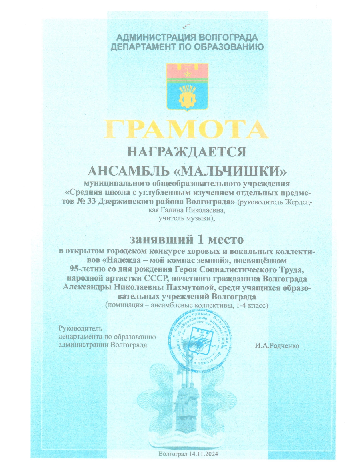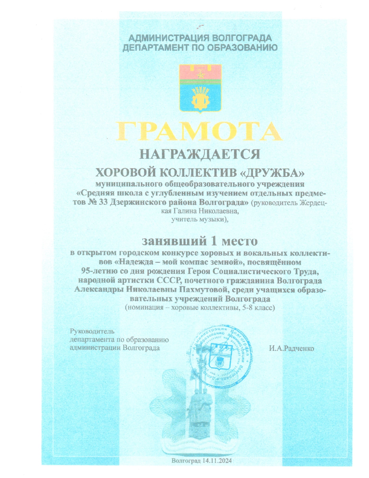 Городской вокальный конкурс «Надежда мой компас земной», посвященный 95 - летию А. Пахмутовой. Приказ № 967 от 21.11.2024 г. 1 место хор «Дружба». 1 место ансамбль «Мальчишки».